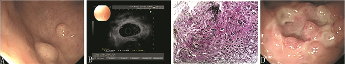 图 1 一例直肠多灶性类癌患者的肠镜及病理图片 A:术前肠镜;B:超声内镜图;C:术后病理(苏木素-伊红染色,×40);D:ESD术后第13日肠镜 |
