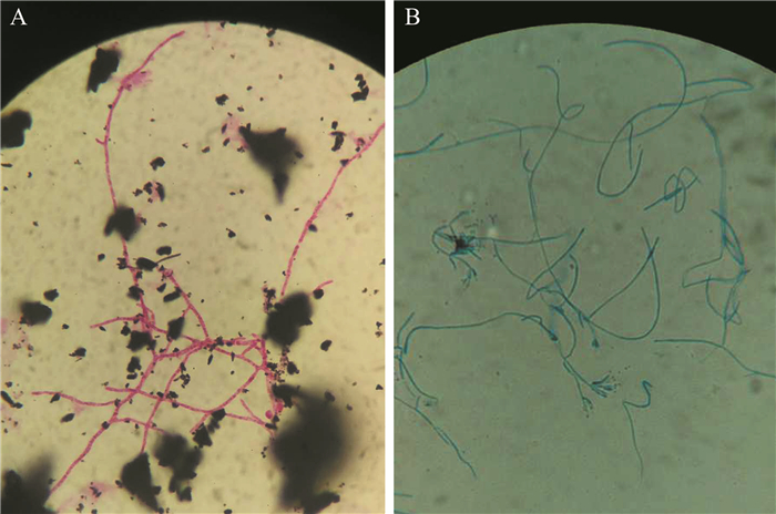 图 1 一例艾滋病合并马尔尼菲青霉败血症患儿血培养及菌落染色结果 A:血培养结果;B:菌落染色结果 |