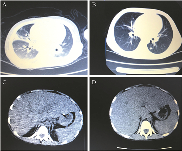 图 3 一例艾滋病合并马尔尼菲青霉败血症患儿的胸部及腹部CT检查结果 A:抗真菌治疗前的胸部CT检查结果,示肺部感染病灶注;B:抗真菌治疗后的胸部CT检查结果,示肺部病灶较前基本吸收;C:抗真菌治疗前的腹部CT检查结果,示肝脏脂肪变性;D:抗真菌治疗后的腹部CT检查结果,示患儿肝脏脂肪变性好转 |