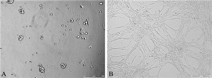 图 1 小鼠心脏CD51+细胞形态(×100) A:不含FBS的心脏干细胞培养基中悬浮生长的小鼠心脏CD51+细胞;B:加入2% FBS后贴壁生长的小鼠心脏CD51+细胞 |