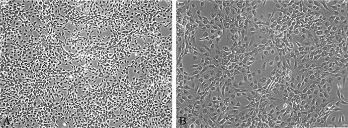 图 2 小鼠心脏CD51+细胞诱导内皮分化后的细胞形态 A: ×50,B:×100 |
