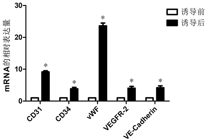 荧光定量PCR结果显示,细胞诱导内皮分化后与诱导前相比,CD31(t=24.529, P=0.002)、CD34(t=6.383, P=0.024)、vWF(t=25.872, P=0.001)、VEGRR-2(t=5.256, P=0.034)、VE-Cadherin(t=5.255, P=0.034)的mRNA相对表达量均增加,见图 3。