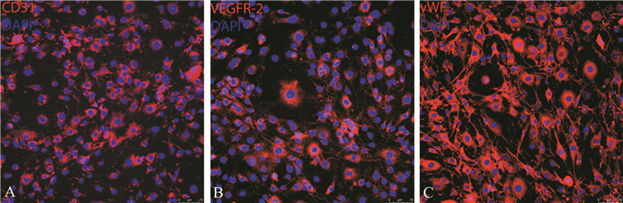 细胞用4%多聚甲醛固定后,BSA封闭40 min,其中vWF组需再用0.2% triton-X100穿透10 min,随后各组加入相应一抗抗体并置4℃过夜,次日室温复温后PBS洗3次,每次5 min,再加入相应二抗,室温避光孵育40 min,PBS洗3次,每次5 min,最后DAPI染核4 min,PBS清洗后制成细胞爬片,倒置荧光显微镜下观察并拍照。