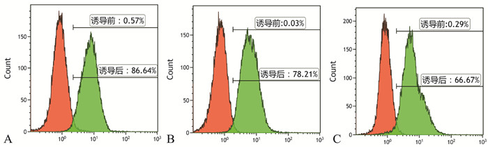 图 5 流式检测分析小鼠心脏CD51+细胞诱导内皮分化前后的内皮相关标志物的表达 A:CD31;B:VEGFR-2;C:vWF;红色:诱导前;绿色:诱导后 |
