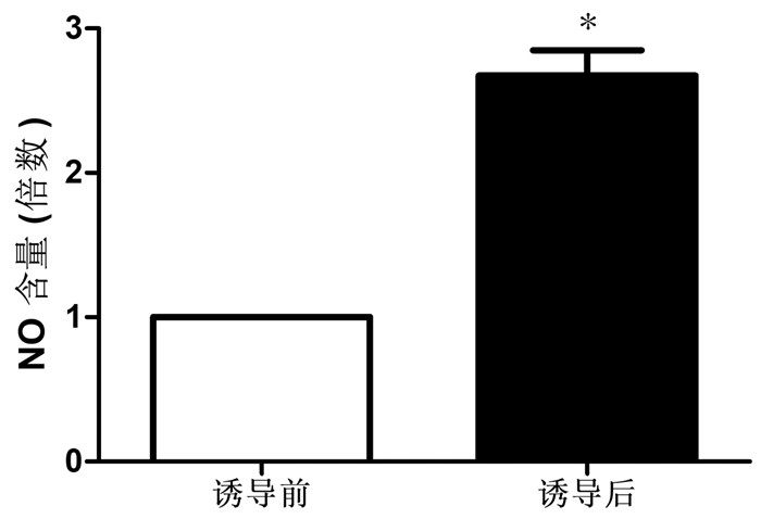 结果显示,诱导内皮分化后细胞的NO含量增加(t=9.549, P=0.011),是诱导前的近3倍,见图 6。