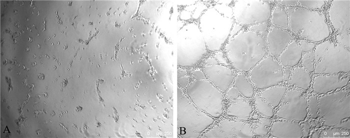 诱导内皮分化后的细胞接种于基质胶后,细胞逐渐贴壁黏附,向四周发散生长并逐渐形成分散的网状,4~6 h后可形成闭合的多边形管腔样结构; 诱导前细胞无形成官腔样结构的能力,见图 7。