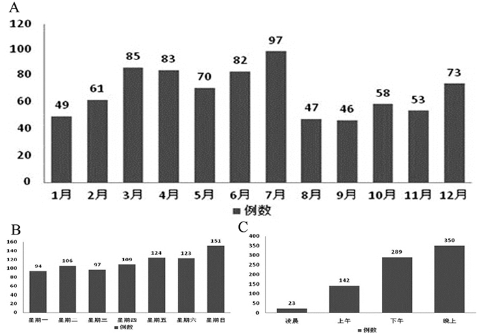 一年之内,7月发病人数最多,占12.06%,其次为3月(10.6%)及5月(10.3%),见图 1A。一周之内,星期日发病人数最多,占18.8%,其次星期五(15.4%)及星期六(15.3%),见图 1B。一日之内,晚上发病人数最多,占43.5%,其次为下午,占35.9%,见图 1C。