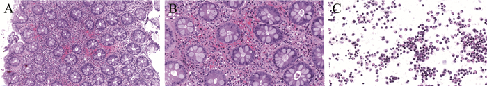 三、诊疗经过给予抗感染、止泻、调节肠道菌群治疗,患者腹部不适及腹泻症状无缓解,期间给予暂停腹膜透析治疗后上述症状可缓解,再次予腹膜透析治疗时,腹部不适及腹泻症状再次出现。2017年10月23日血常规:血红蛋白90 g/L,白细胞12.1×109/L,红细胞2.63×1012/L,血小板210×109/L,淋巴细胞比率0.173,中性粒细胞比率0.384,EOS比率0.409、绝对值4.94×109/L。2017年10月26日,胃肠镜提示:①慢性浅表性胃炎;②结肠炎症改变;③内痔。肠黏膜病理活组织检查(活检):(升结肠、乙状结肠、直肠黏膜)中-重度黏膜慢性活动性炎症伴糜烂,并见中等-较多EOS浸润(约20~60/高倍视野),见图 1A、B。2017年10月27日腹膜透析液离心找EOS (图 1C),2017年11月1日结果回报:EOS>50%,未见确切肿瘤细胞。2017年10月27予甲泼尼龙40 mg/d静脉滴注,2017年10月29日患者腹部不适症状消失,腹泻缓解,开始每日解1次黄色成形大便。2017年10月29日血常规:血红蛋白102 g/L,白细胞5.7×109/L,红细胞2.53×1012/L,血小板181×109/L,淋巴细胞比率0.219,中性粒细胞比率0.743, EOS比率0.002、绝对值0.01×109/L。2017年10月30日改口服甲泼尼龙20 mg/d,此后患者一直无腹部不适及腹泻症状,病情好转,于2017年11月2日办理出院。出院后于2017年11月5日停用肾上腺皮质激素(激素)治疗,2017年11月10日门诊复查血常规:血红蛋白109 g/L,白细胞9.0×109/L,红细胞2.7×1012/L,血小板215×109/L,淋巴细胞比率0.277,中性粒细胞比率0.570,EOS比率0.089、绝对值0.8×109/L。随访至撰稿日,患者病情未见复发。