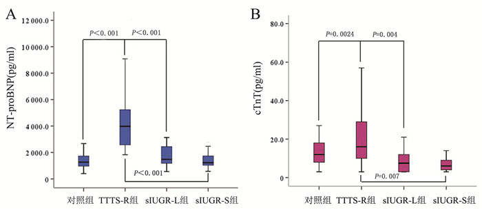 图 1 TTTS-R组、sIUGR-L组、sIUGR-S组和对照组NT-proBNP和cTnT水平比较 A:羊水NT-proBNP水平比较;B:羊水cTnT比较 |