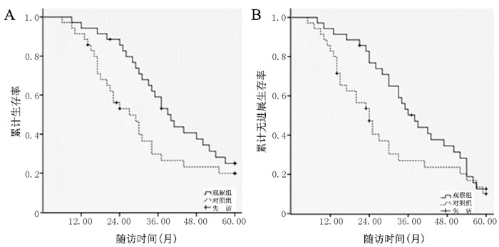 图 1 观察组与对照组中央型肺癌患者的生存曲线分析 A:总生存曲线;B:无进展生存曲线 |