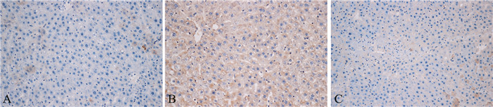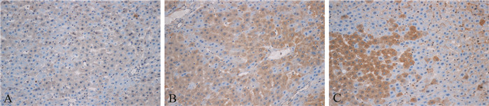 图 2 各组大鼠肝组织Atg5免疫组化结果(×400) A:正常组;B:模型组;C:姜黄素组 |