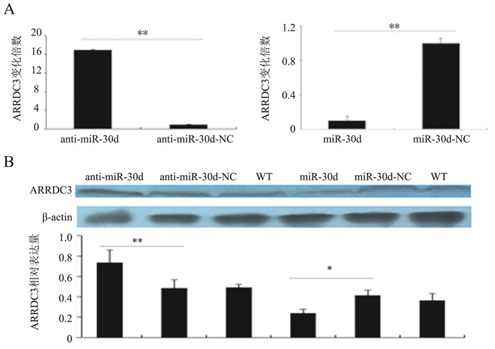 图 1 ARRDC3与miR-30d表达相关性的分析 A:实时定量PCR结果;B:蛋白免疫印迹法结果;anti-miR-30d:抑制表达miR-30d;anti-miR-30d-NC:未抑制表达miR-30d (对照);miR-30d:过表达miR-30d;miR-30d-NC:无过表达miR-30d (对照);组间比较,*P < 0.05,**P < 0.01 |