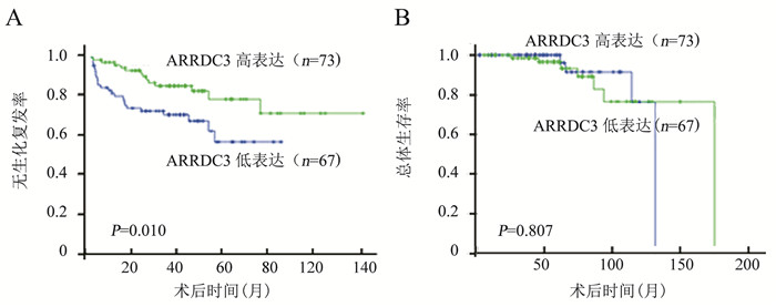 图 2 ARRDC3 mRNA表达水平与前列腺癌患者预后的关系 A:无生化复发生存率;B:总体生存率 |