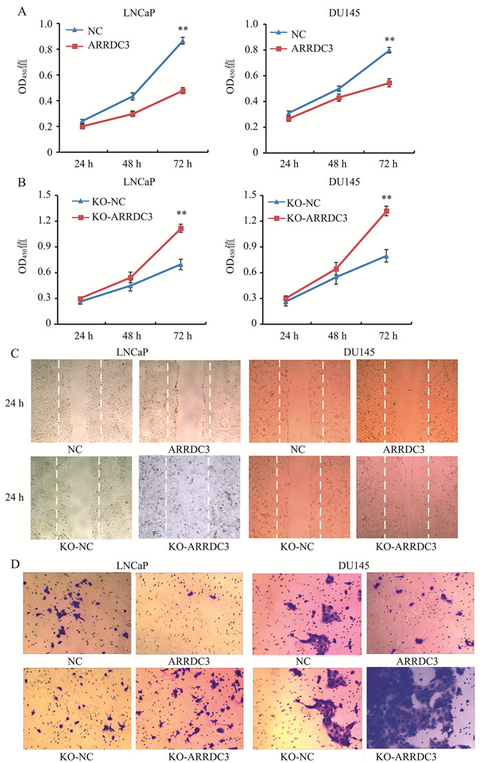 3. 侵袭实验结果LNCaP与DU145细胞中,与NC组比较,ARRDC3组的穿膜细胞数均较少;与KO-NC组比较,KO-ARRDC3组的穿膜细胞数较多,见图 3D。