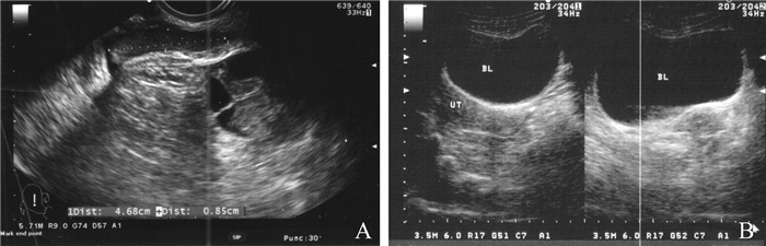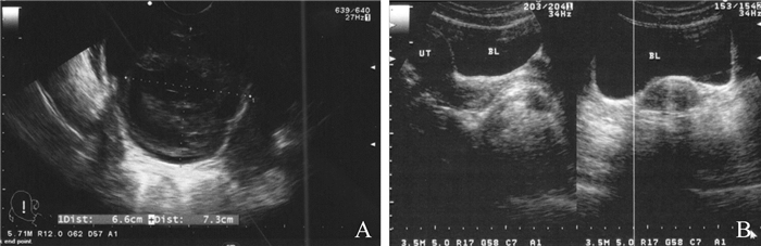 图 2 经阴道穿刺取卵术后并发膀胱损伤患者(病例3)的B超检查结果 A:治疗前可见膀胱有不均质混合回声包块;B:治疗后混合回声团明显缩小 |