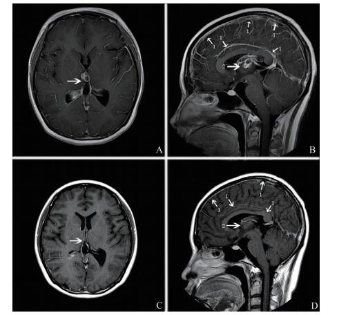 图 1 CNS诺卡菌感染例1患者头颅MRI A、B:治疗前头颅MRI增强图像显示右侧基底节片状异常信号影呈环状明显强化,并突向第三脑室内(A中箭头及B中箭头2所指处),有明显脑膜强化(B中箭头1所指处); C、D:治疗后头颅MRI增强图像显示右侧基底节片状异常信号影消失(C中箭头及D中箭头2所指处),未见明显脑膜强化(D中箭头1所指处) |