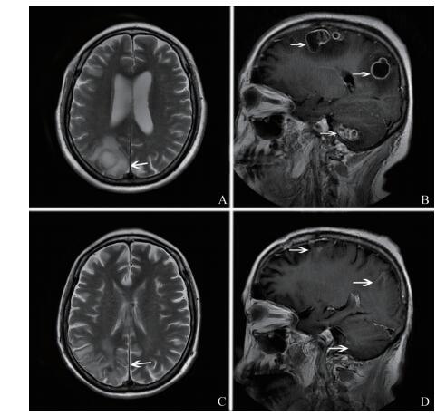 图 2 CNS诺卡菌感染例2患者头颅MRI A、B:治疗前头颅MRI图像,右侧枕叶T2加权像上见类圆形长T2信号影,边缘见等信号壁,病灶周边环形低信号(A箭头所指处),额顶枕叶、小脑脚多发强化病灶(B箭头所指处); C、D:治疗后头颅MRI图像,右侧枕叶T2加权像上病灶呈斑片状长T2信号,较前吸收、缩小,邻近周围脑实质内见片状稍长T1稍长T2信号水肿区,范围较前缩小(C箭头所指处),额顶枕叶多发强化病灶,强化灶较前减少、缩小(D箭头所指处) |