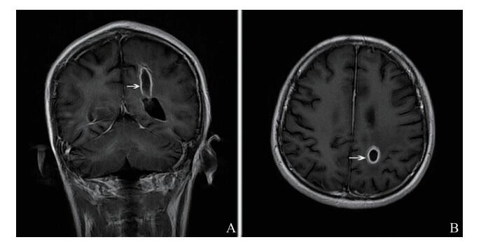 图 3 CNS诺卡菌感染例3患者头颅MRI 治疗前颅脑MRI增强图像,左侧侧脑室后角旁见一类圆形病灶,增强扫描环状强化,病灶周围水肿明显(A、B箭头所指处) |