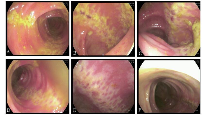 图 3 一例腹型过敏性紫癜患者治疗前结肠镜检查 A、B:升结肠; C~E:横结肠; F:降结肠 |