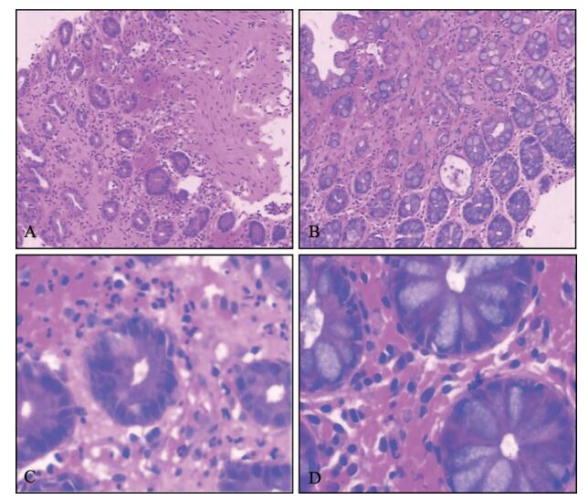 图 4 一例腹型过敏性紫癜患者结肠病理 A、B:苏木素-伊红染色,×40;C、D:苏木素-伊红染色,×400 |