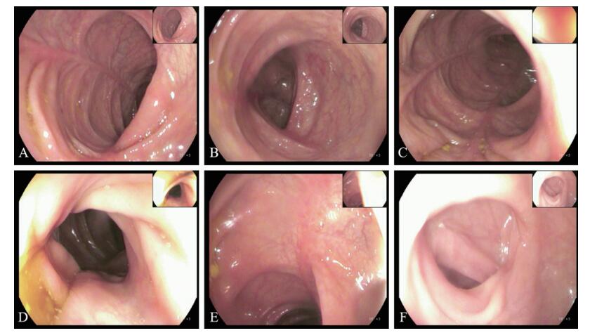 图 5 一例腹型过敏性紫癜患者治疗后结肠镜检查 A、B:升结肠; C:横结肠; D、E降结肠; F:直肠上段 |