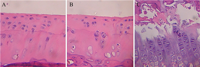 图 1 随访结束时CIA大鼠右踝关节软骨病理学结果(HE染色,×400) A:倍他米松单次治疗组;B:倍他米松多次治疗组;C:空白对照组 |