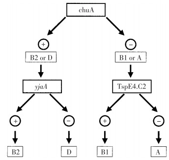 2. 菌株进化分群使用引物对ChuA、YjaA、TspE4C2.、TspE4Ⅱ片段进行PCR扩增,引物及退火温度见参考文献[5]。扩增为阳性的片段送往上海生工生物工程技术有限公司进行一代测序,测序结果与数据库中片段进行在线BLAST比对,确认为目标片段。进化分群的决策流程见图 1[2]。