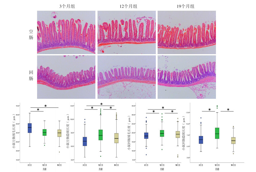 结果 一、小肠上皮的形态随衰老的变化空肠绒毛长度3组对比H=113.202,P < 0.001,3个月小鼠绒毛长度大于12个月和19个月的小鼠(P均 < 0.017),而12个月的小鼠和19个月的小鼠绒毛长度比较差异无统计学意义(P = 0.232)。回肠绒毛长度3组对比H=35.636,P < 0.001,12个月小鼠绒毛较3个月的小鼠长(P < 0.017),而19个月的小鼠较12个月的小鼠更短(P < 0.017),19个月和3个月小鼠对比差异亦有统计学意义(P < 0.017),见图 1。