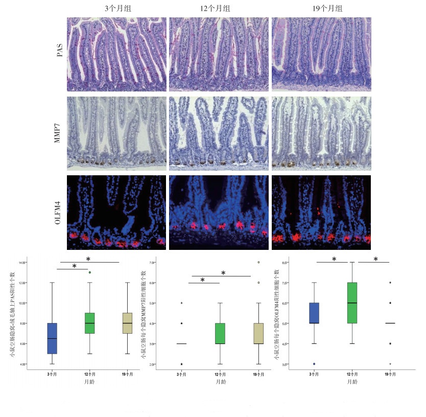 小肠黏膜的主要功能是吸收和防御,其中肠上皮发挥了重要作用。小肠上皮细胞主要分为吸收性肠上皮细胞、杯状细胞、潘氏细胞、内分泌细胞、干细胞等,小肠上皮更新速度快,约4 ~ 5 d更新1次,而隐窝中的潘氏细胞寿命约1个月。随着年龄增长,肠道功能逐渐减退[1-3]。对此已有相关研究,但因为取材位置、年龄选取等原因,结果各不相同。