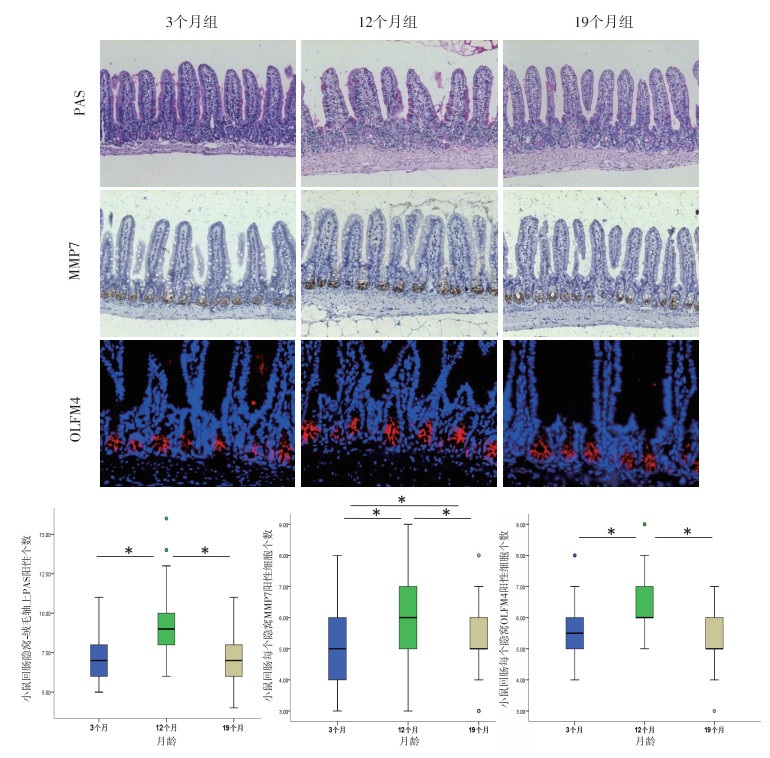 图 3 3个年龄段小鼠回肠染色及计数 PAS:3组对比H = 94.595,P < 0.001,3个月vs. 12个月P < 0.001,12个月vs. 19个月P < 0.001,19个月vs. 3个月P = 0.582;MMP7:3组对比H = 66.854,P < 0.001,3个月vs. 12个月P < 0.001,12个月vs. 19个月P < 0.001,19个月vs. 3个月P = 0.008;Olfm4:3组对比H = 46.611,P < 0.001,3个月vs. 12个月P < 0.001,12个月vs. 19个月P < 0.001,19个月vs. 3个月P = 0.300;PAS糖原染色,×200;MMP-7免疫组化染色,×200;OLFM4免疫荧光染色,×400;*P < 0.017 |