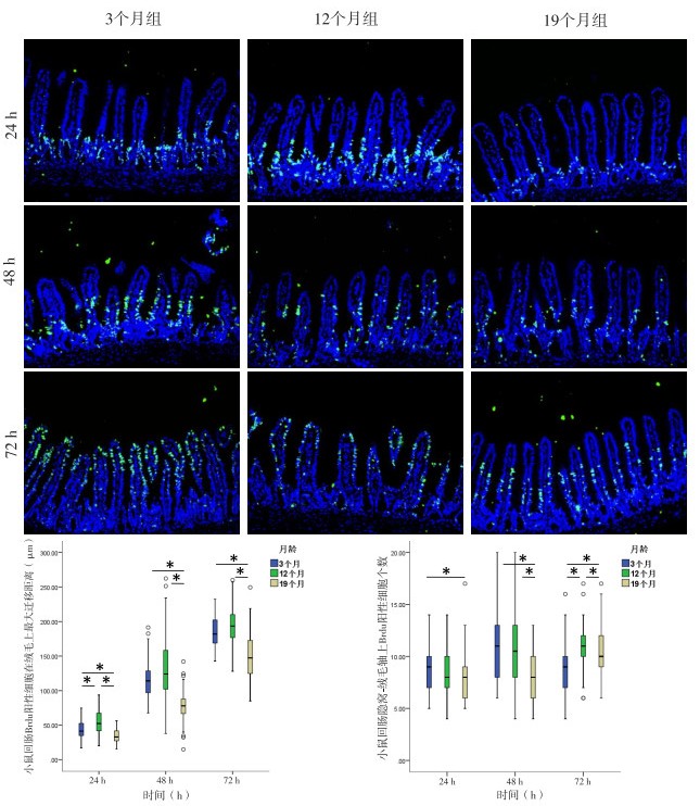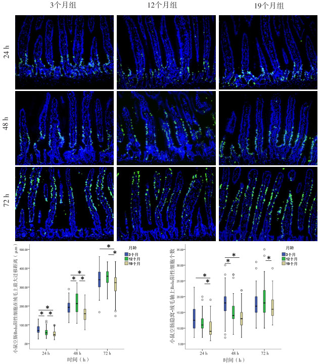 Brdu是一种胸腺嘧啶核苷类似物,对小鼠进行腹腔注射,可使其掺入小肠隐窝内正在复制的DNA中,从而标记隐窝底部的肠上皮,小肠上皮在增殖、分化和成熟的过程中,一直向绒毛顶端移动,直到移动到绒毛最顶端发生凋亡。经过一段时间处死小鼠,即可通过小肠上皮当前的位置评估小肠上皮的迁移情况[10]。因此,本实验使用Brdu标记正在复制DNA的肠上皮细胞来测定小肠增殖的速度。虽然空肠和回肠的结果具有差异,但是总体趋势一致。综合观察3个时间段,19个月的小鼠在不同时间段、不同部位的条件下,最大移动距离都低于3个月和12个月的小鼠。之前有文献对比了2 ~ 4个月和20 ~ 22个月小鼠在72 h的移动距离,本实验与该文献结果一致[10]。本实验同时统计了隐窝-绒毛轴上Brdu阳性细胞的个数,发现19个月的小鼠标记的肠上皮个数也同样低于另外2组。19个月小鼠增殖速度明显低于另外2组,说明其增殖功能受损。需要特别说明的是,由于Brdu溶液是一种广泛使用的增殖标记物,如果腹腔注射不成功则不会在小肠中出现任何阳性信号。目前没有资料表明Brdu在用于标记时对目标器官产生额外影响。在查阅过的参考文献中,利用该标记物计算肠上皮迁移速率时,也并不针对这一操作设置空白对照组[11-13]。因此,本实验同样没有设置空白对照组。