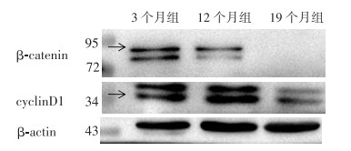 用蛋白免疫印迹法检测了2个与增殖有关的蛋白:β-catenin和cyclinD1。蛋白条带结果显示,β-catenin和cyclinD1的条带在19个月组中明显浅于其他2组,而3个月组和12个月组未见明显的差异,见图 6。